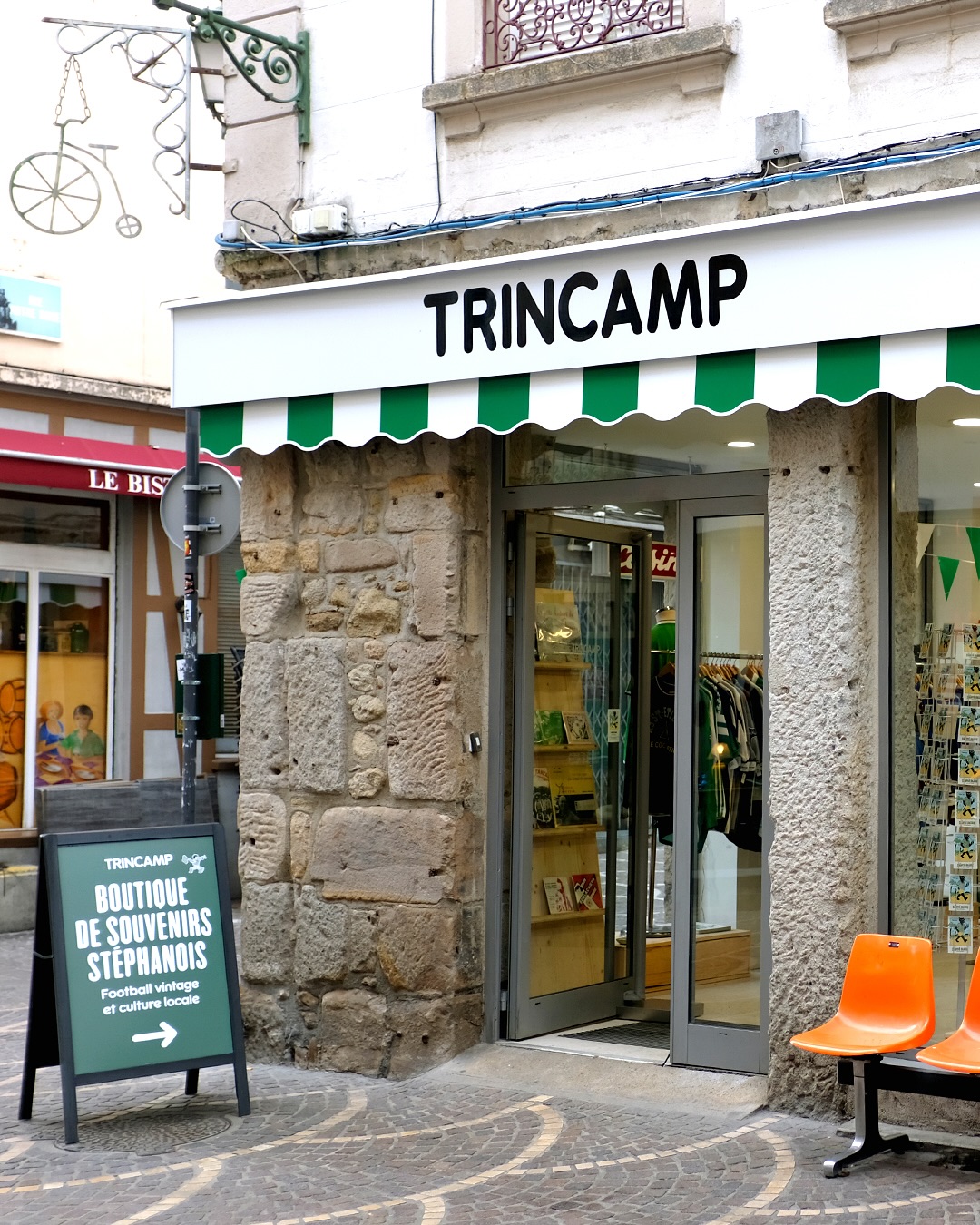 Situé en plein cœur du centre ville de Saint-Étienne, dans la rue la plus festive de Saint-Étienne, la rue des Martyrs, Trincamp est une boutique de souvenirs dédiée au football vintage et à la culture stéphanoise. Vous y trouverez une fine sélection de maillots vintages et objets collectors des Verts mais aussi toutes sortes d’objets et de collections faisant la part belle au patrimoine, à l’héritage industriel et commercial de Saint-Étienne.