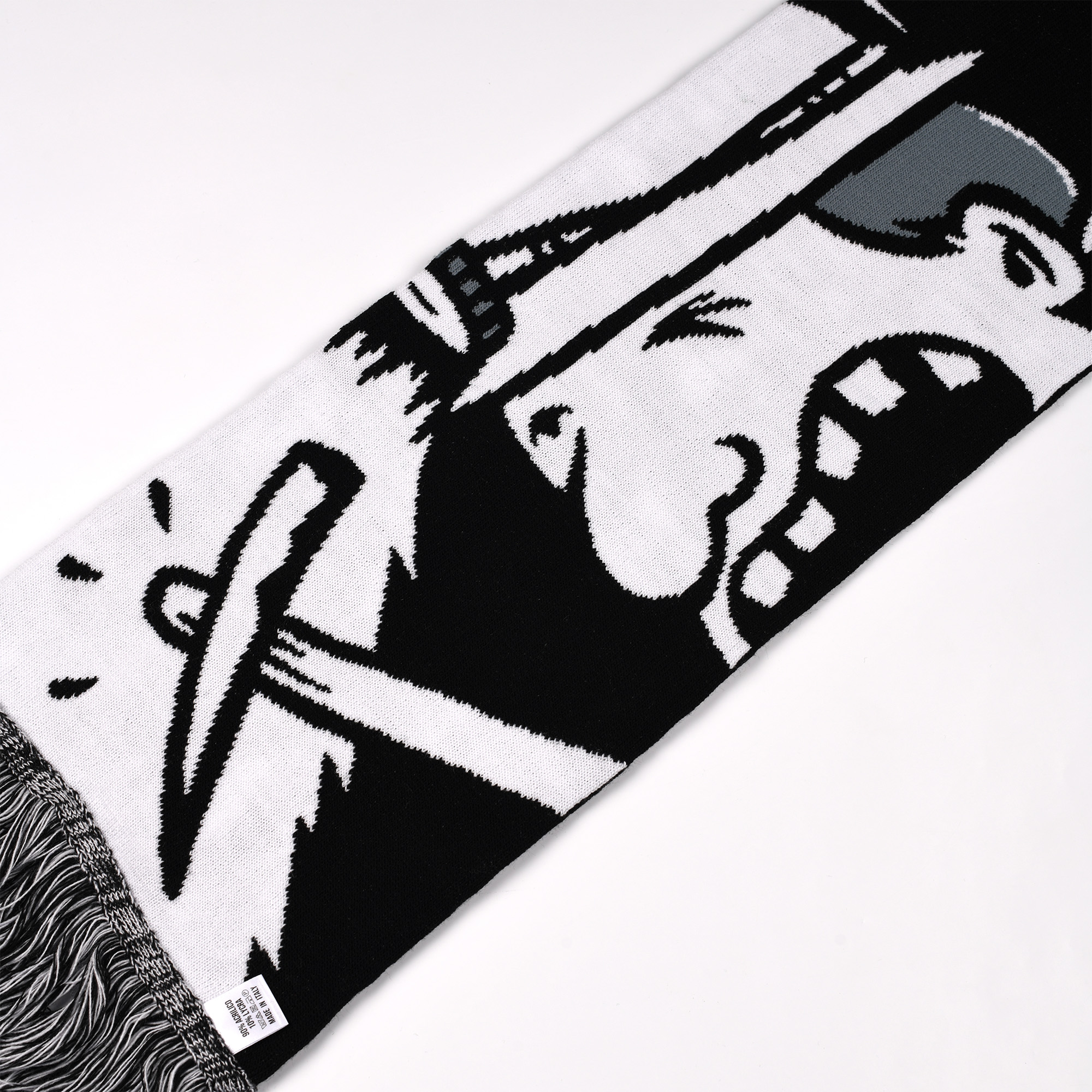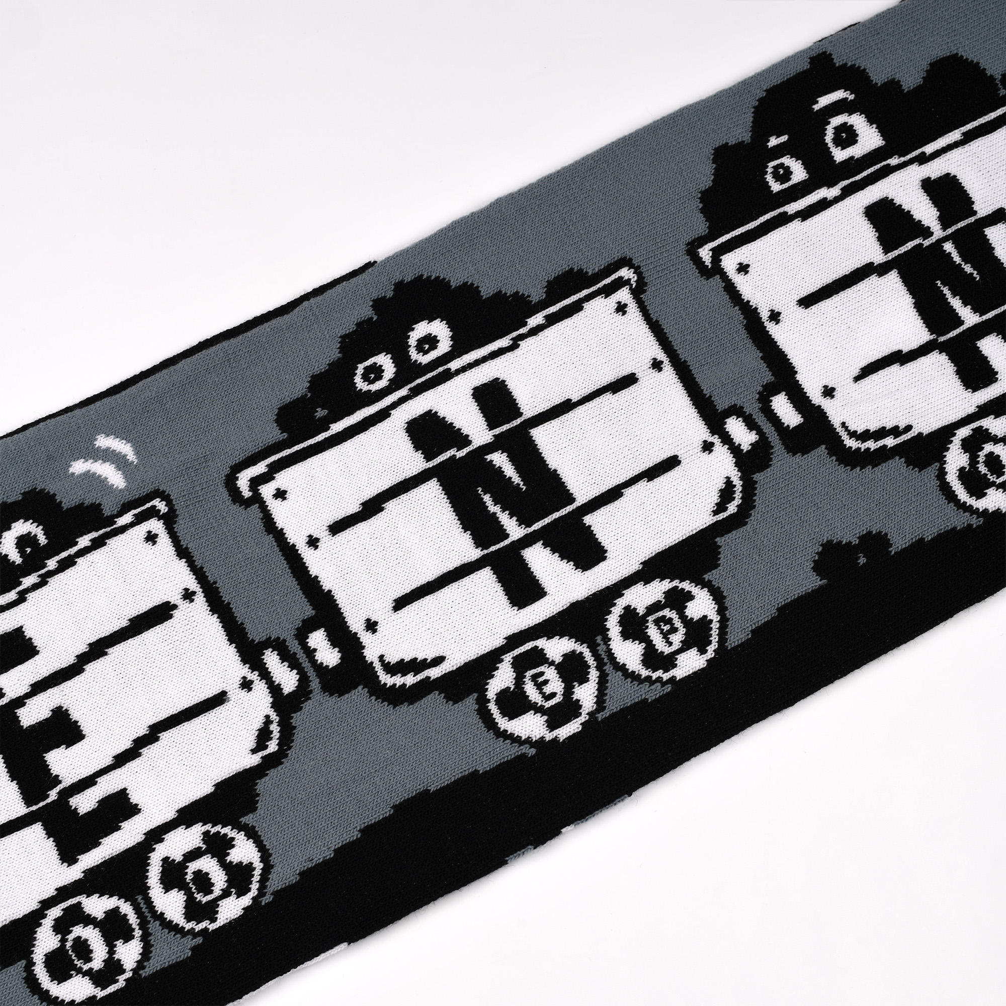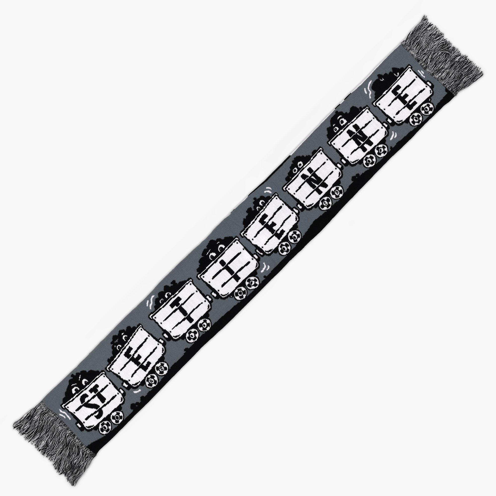 Dessinée par le duo d’artistes stéphanois Ella&Pitr, cette écharpe rend un vibrant hommage à nos gueules noires. Avec d’un côté 8 bennes portant les lettres de St Etienne, et de l’autre, trois gueules noires