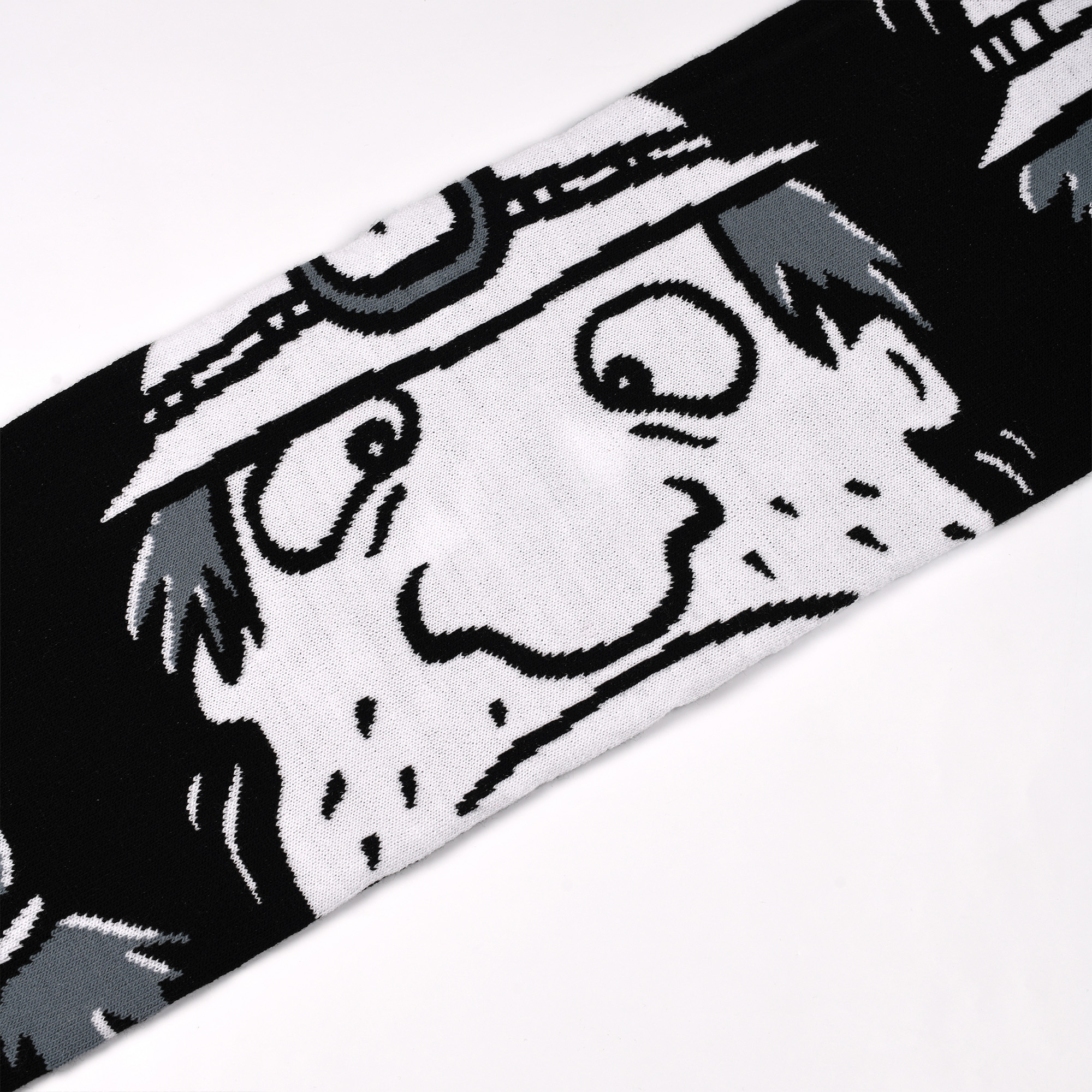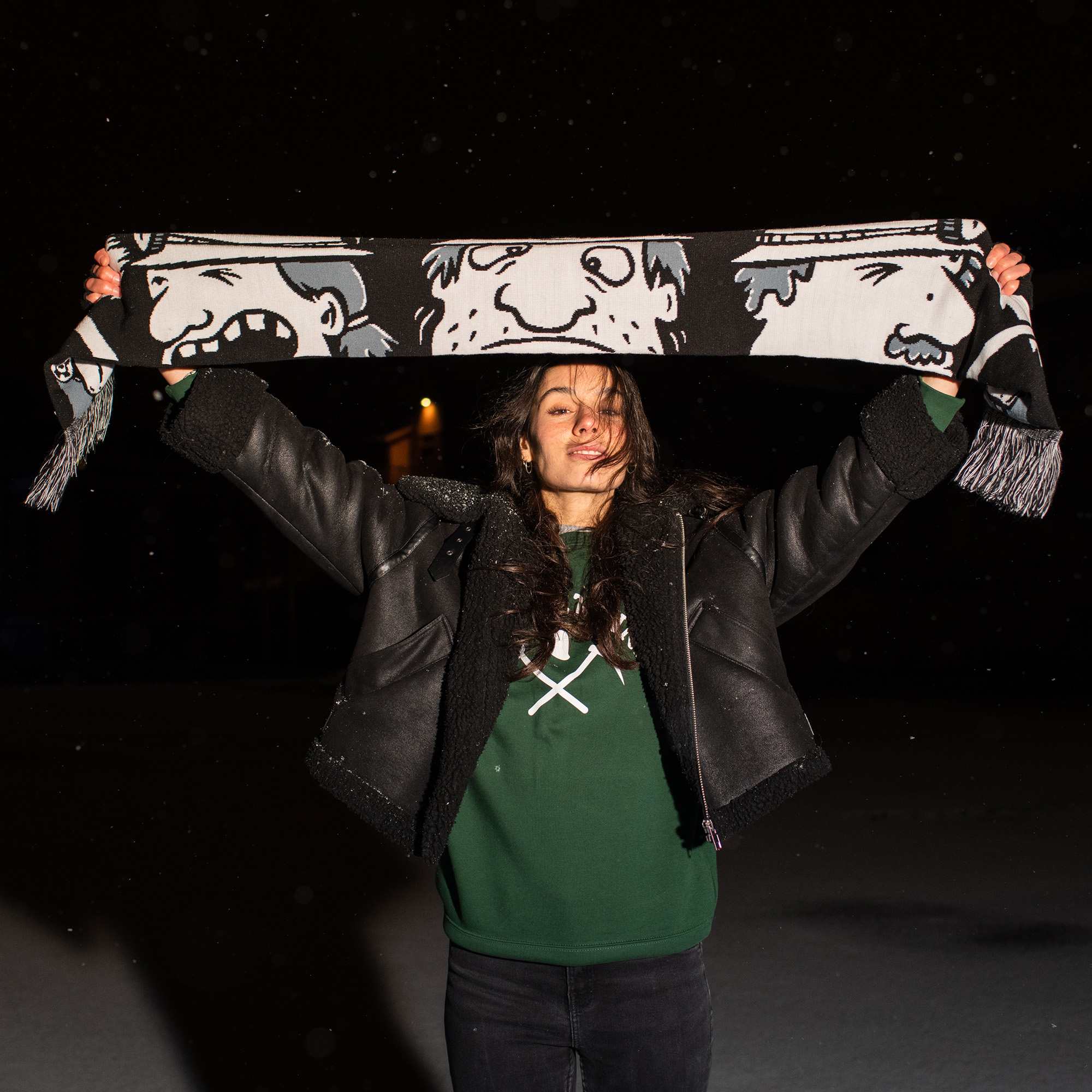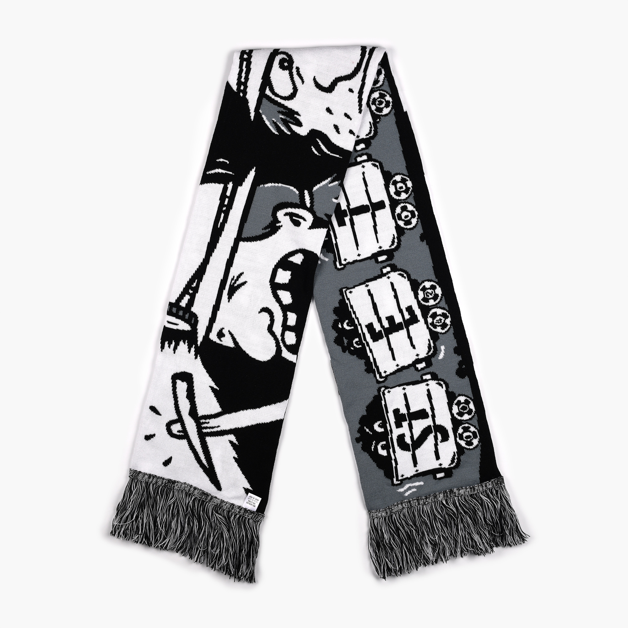 Dessinée par le duo d’artistes stéphanois Ella&Pitr, cette écharpe rend un vibrant hommage à nos gueules noires. Avec d’un côté 8 bennes portant les lettres de St Etienne, et de l’autre, trois gueules noires