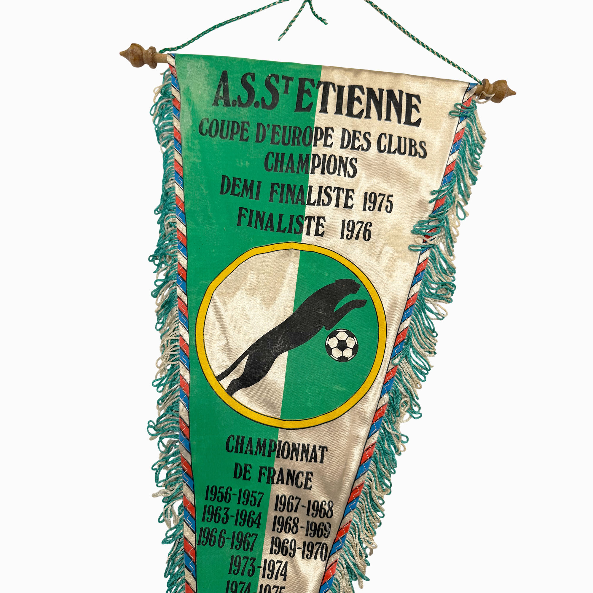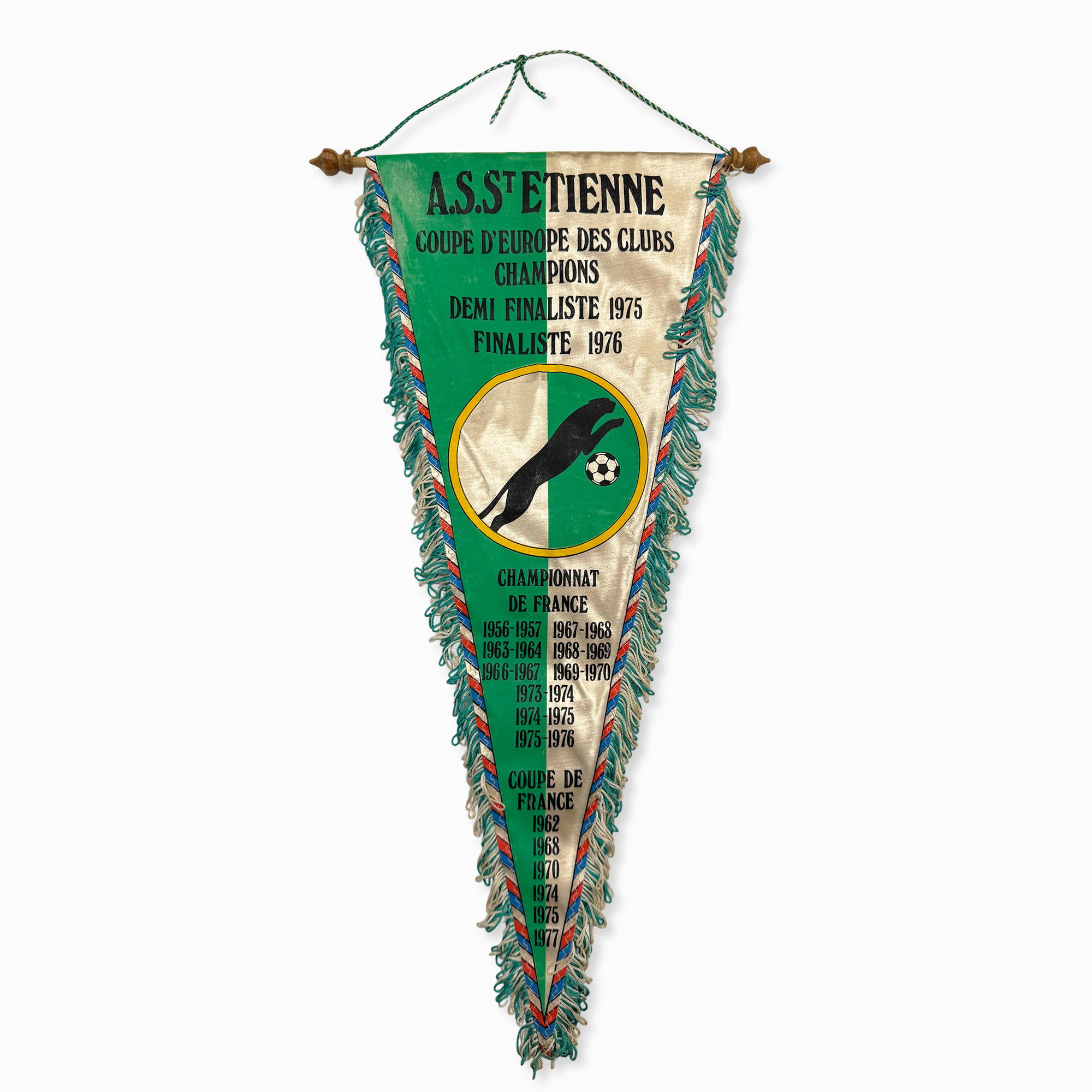 Magnifique grand fanion ASSE palmarès de collection, commercialisé au lendemain de la finale de 1976.