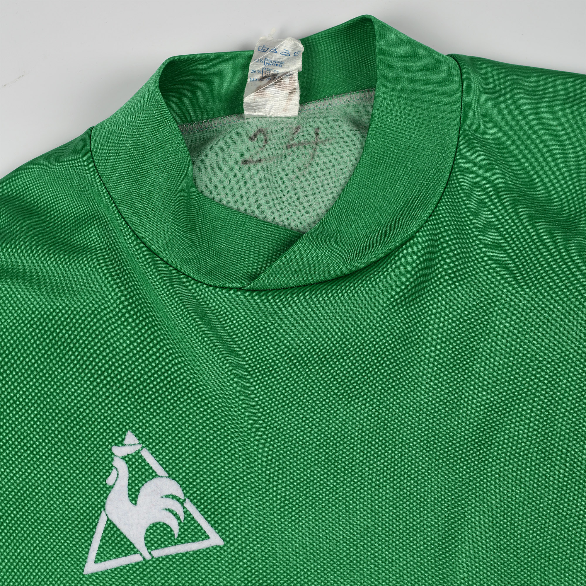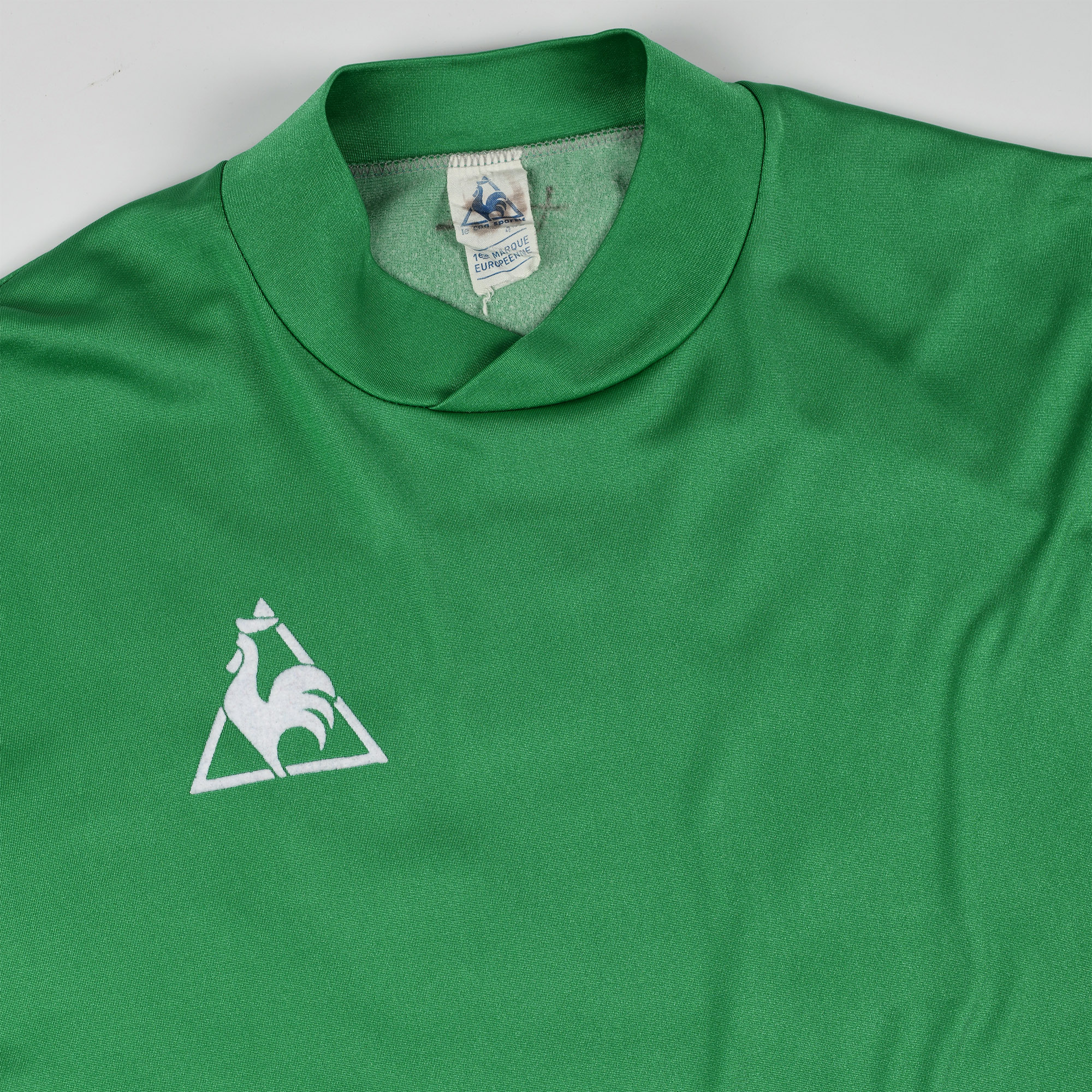 Contrairement aux maillots de Championnat, ce maillot n’a pas de flocage Super Télé à l’avant et le logo Le Coq Sportif est dans sa version minimaliste (avec seulement le coq). Alors, même si ce maillot n’a pas été porté en match, il reste une pièce remarquable et relativement rare dans cette configuration Coupe d’Europe.