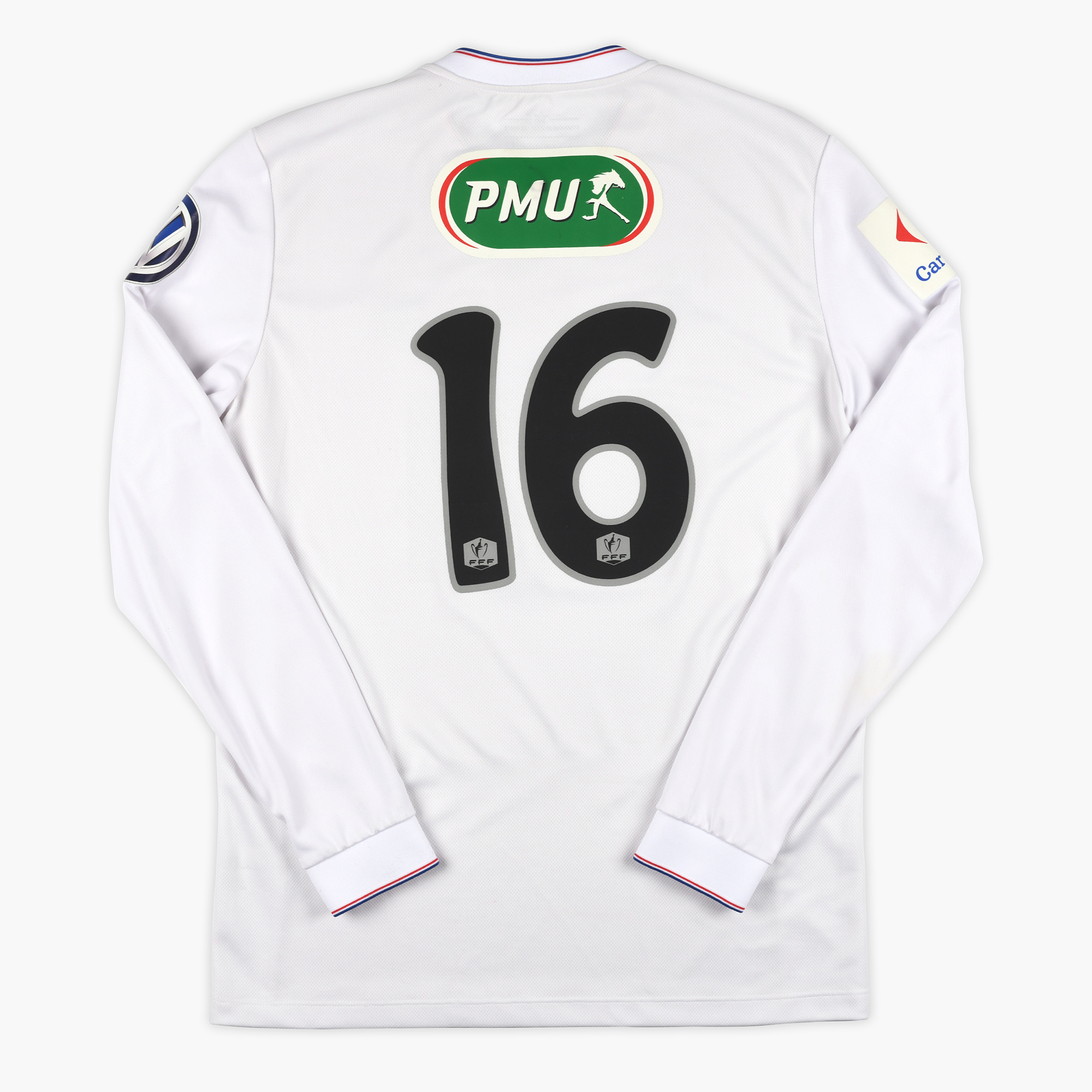 Après de longues recherches et par déduction avec les autres numéros présents sur la pelouse, nous avons conclu que ce maillot numéro 16 avait été préparé pour Jérémy Clément. De plus, un numéro 6 inscrit au marqueur au niveau du col nous permet d’aller dans ce sens.