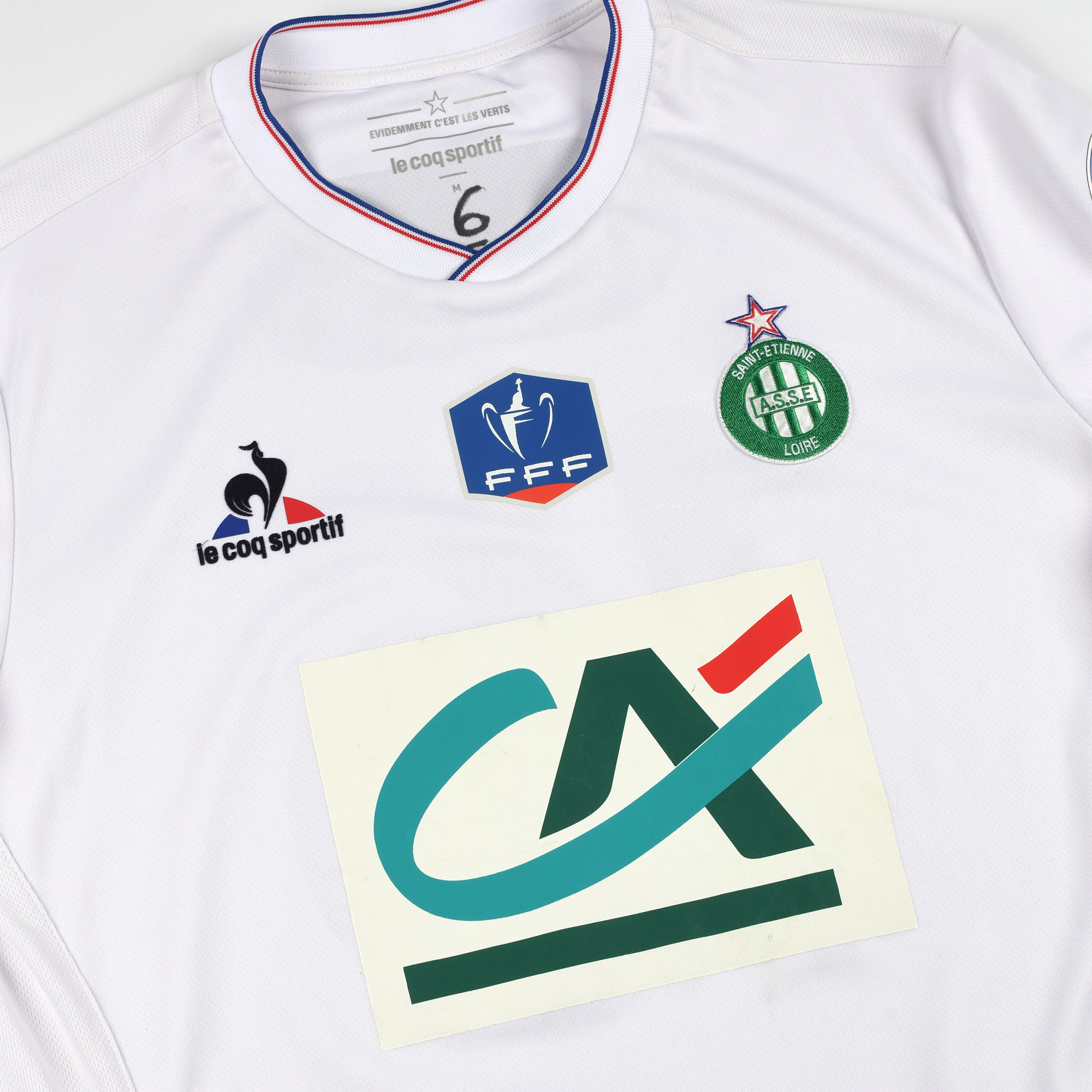 Ce maillot ASSE Jérémy Clément est un maillot préparé pour le joueur lors du 8ème de finale de la Coupe de France contre Troyes. Seule rencontre de la compétition où les Stéphanois ont évolué avec ce maillot blanc et le sponsor Crédit Agricole.