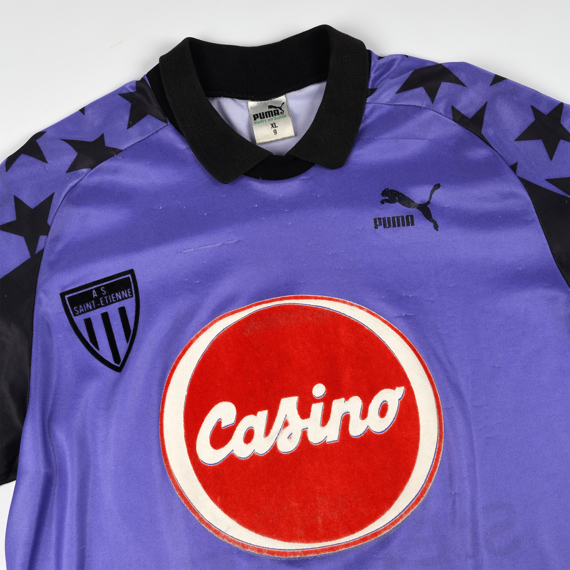 Pour information, ce design de maillot a également été utilisé lors des saisons 1990/1991 et 1991/1992 en version jaune et grise. Mais cette version violette est bien celle de la saison 1992/1993 et a été portée notamment lors de la 3ème, 5ème, 6ème ou encore 7ème journée par Joseph-Antoine Bell. Dans cette même configuration, sans flocage Casino au dos.