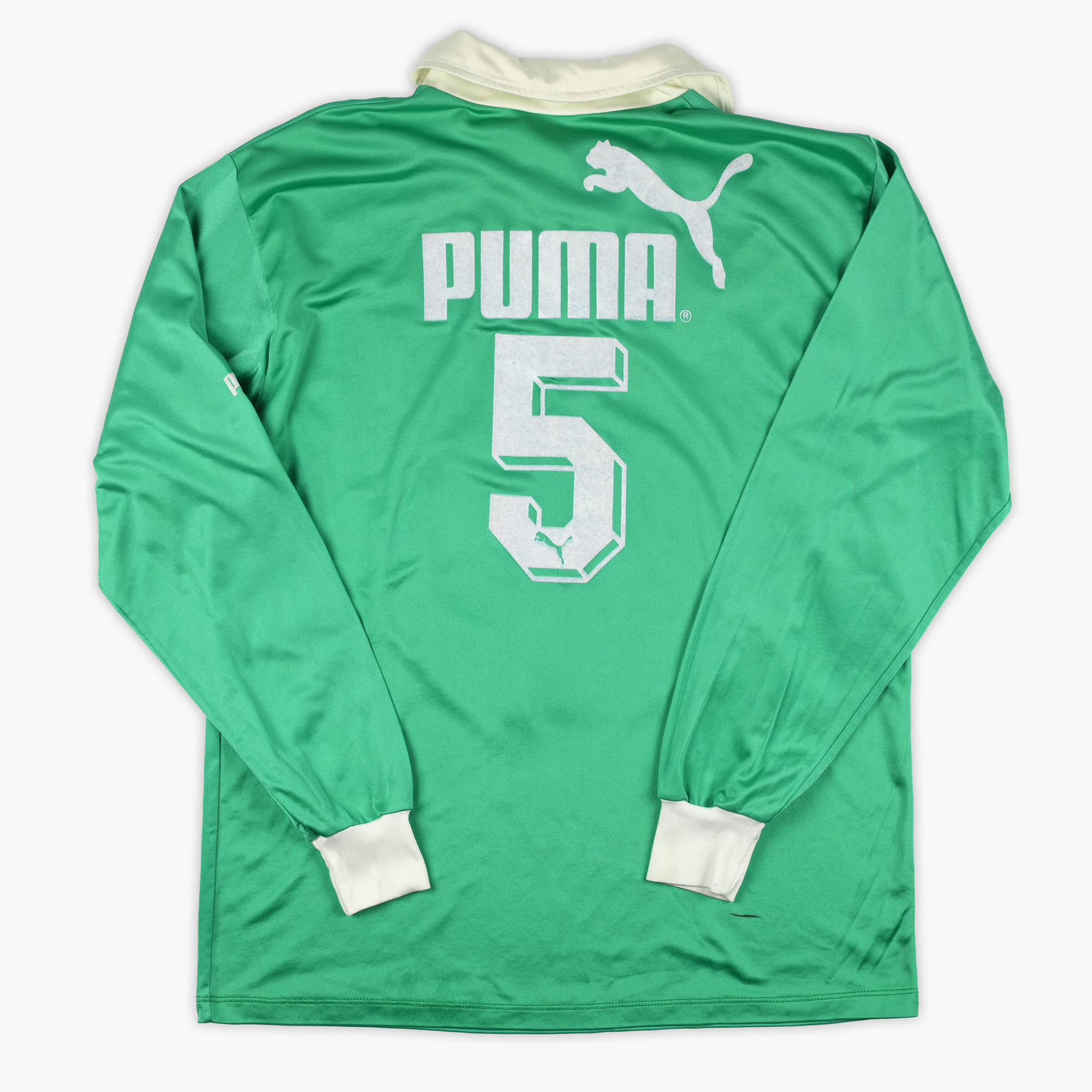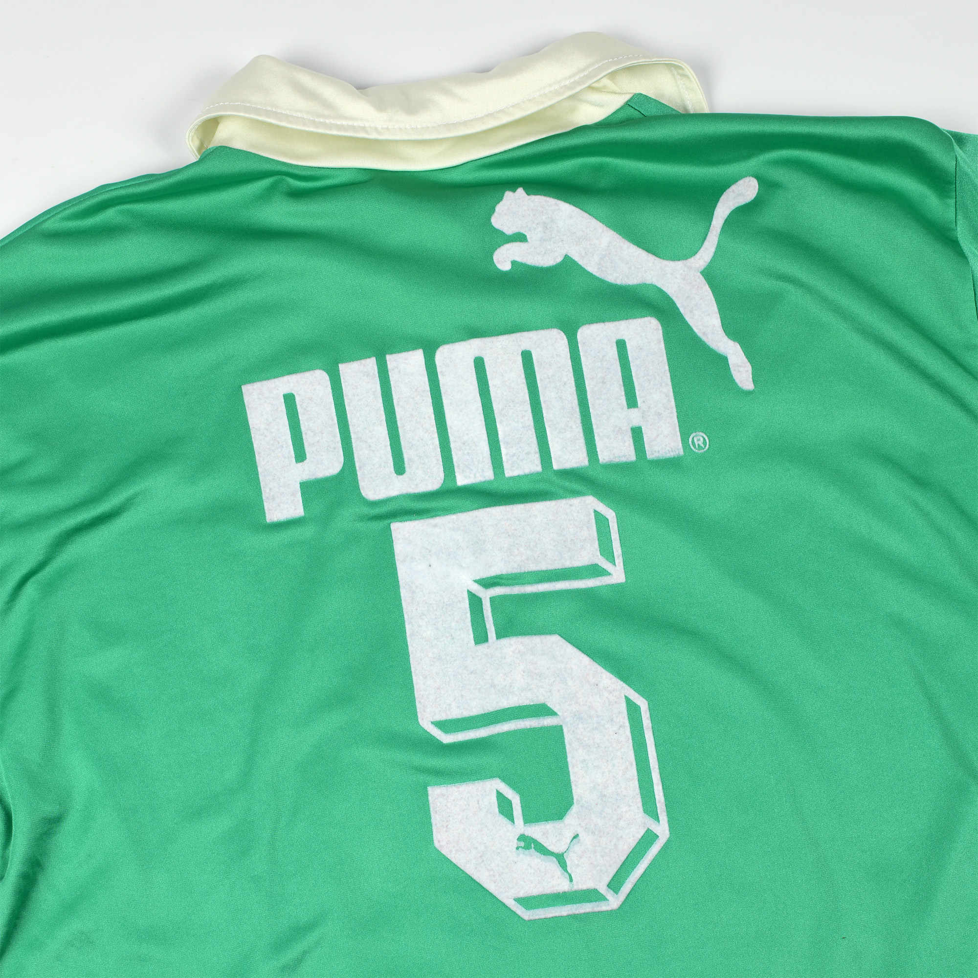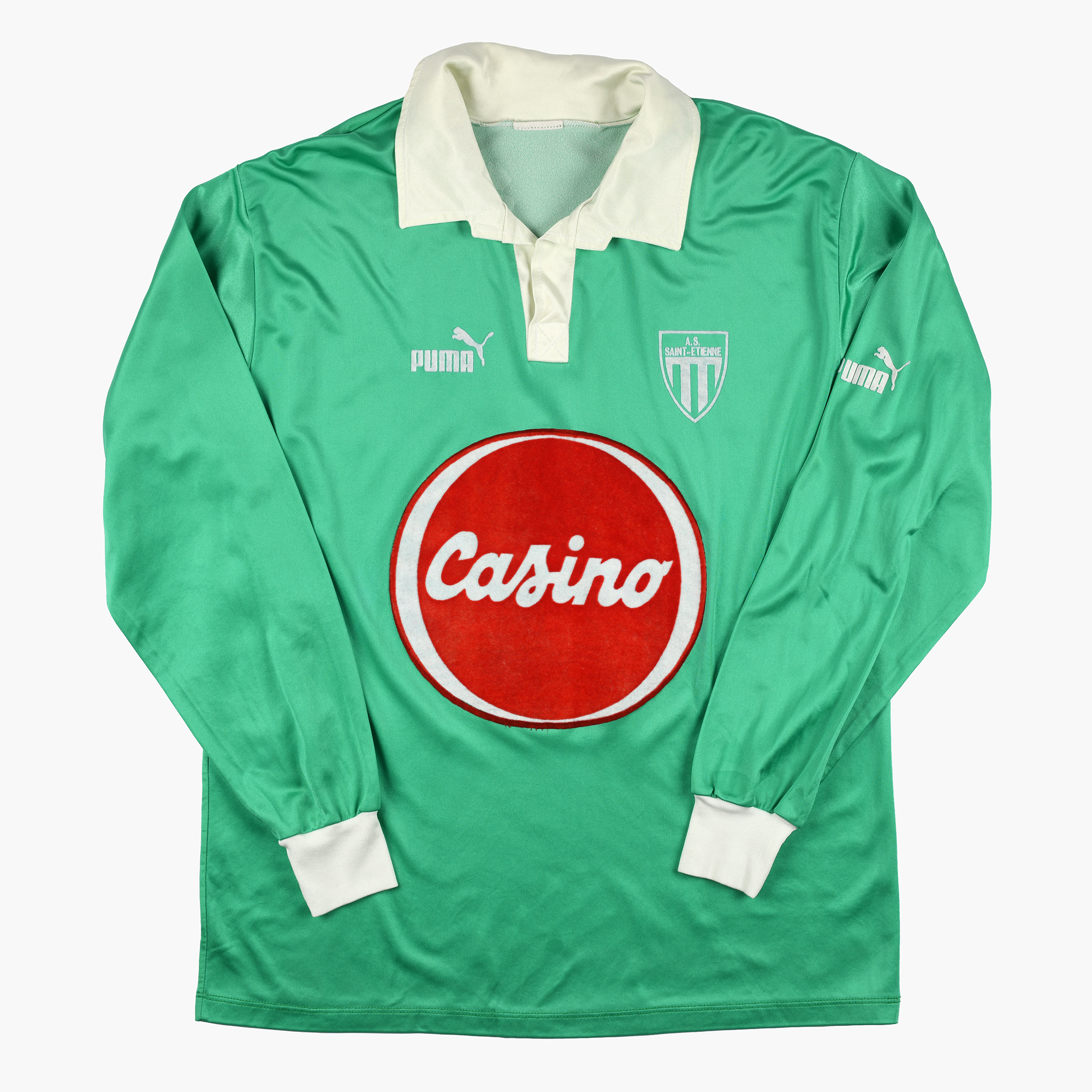 En plus d’être dans un excellent état de conservation, ce maillot a la particularité d’avoir une configuration spéciale au dos. Avec le flocage « Puma » et non le flocage « Casino ». D’après nos recherches, ce maillot n’a pas été utilisé en match mais était une version d’entraînement. Fait amusant, lors de la 13ème journée de Championnat, on remarque que deux Stéphanois rentrent sur la pelouse et portent le même numéro 7. L’un avec le flocage « Casino » au dos et l’autre avec le flocage « Puma ».
