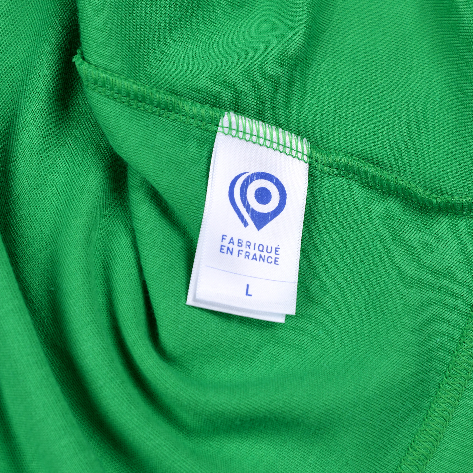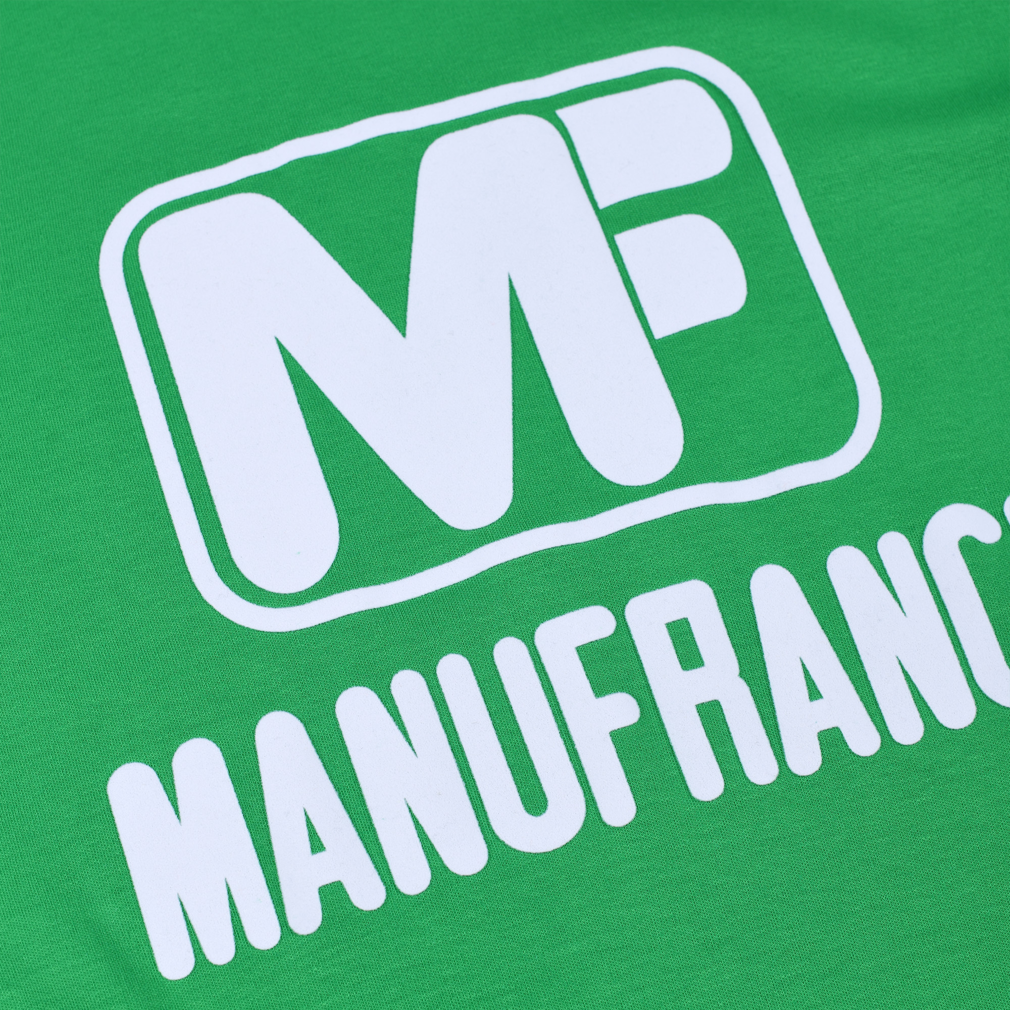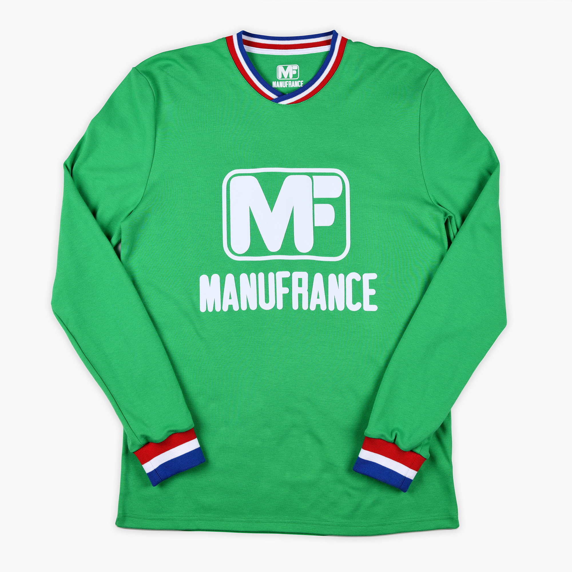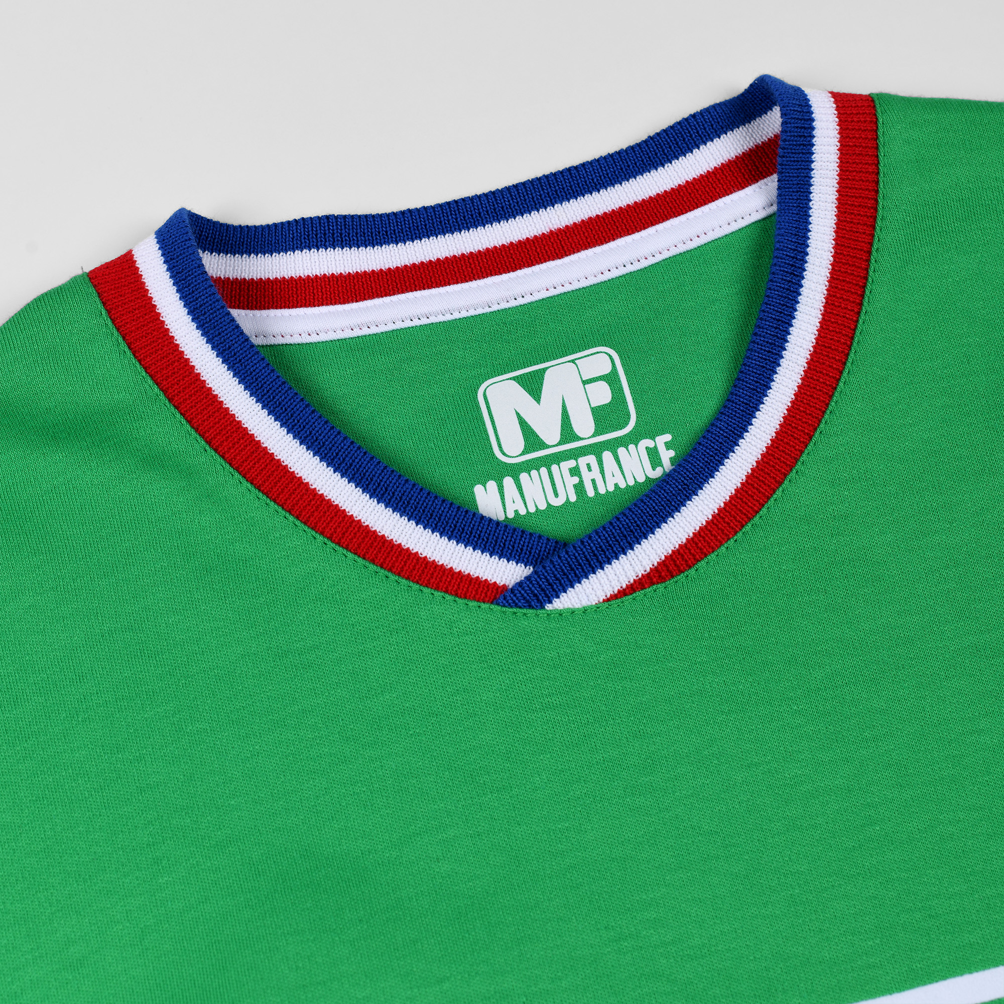Conçu et fabriqué entièrement en France, cette réédition du maillot Manufrance a demandé pas moins de cinq artisans français. Notamment pour la confection des bord-côtes bleu blanc rouge, la teinte verte exacte de la couleur historique du maillot, le flocage velours du logo Manufrance et enfin l’assemblage des tissus.