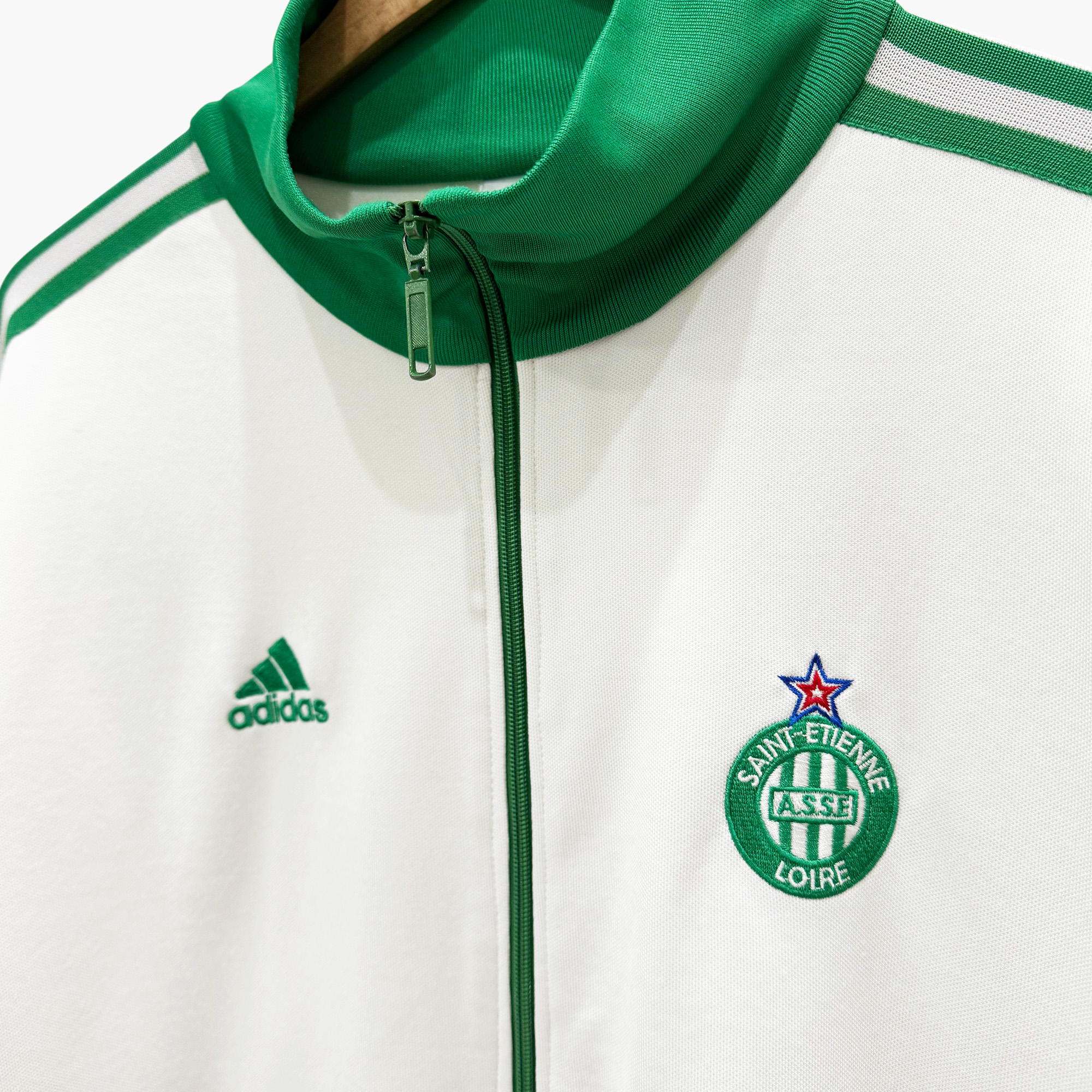 Les vestes ASSE adidas blanches ont été commercialisées dans les années 2000/2010 lorsqu’Adidas était devenu l’équipementier des Verts. D’inspirations rétro, ces vestes classiques n’ont pas perdu de leur charme avec les années.